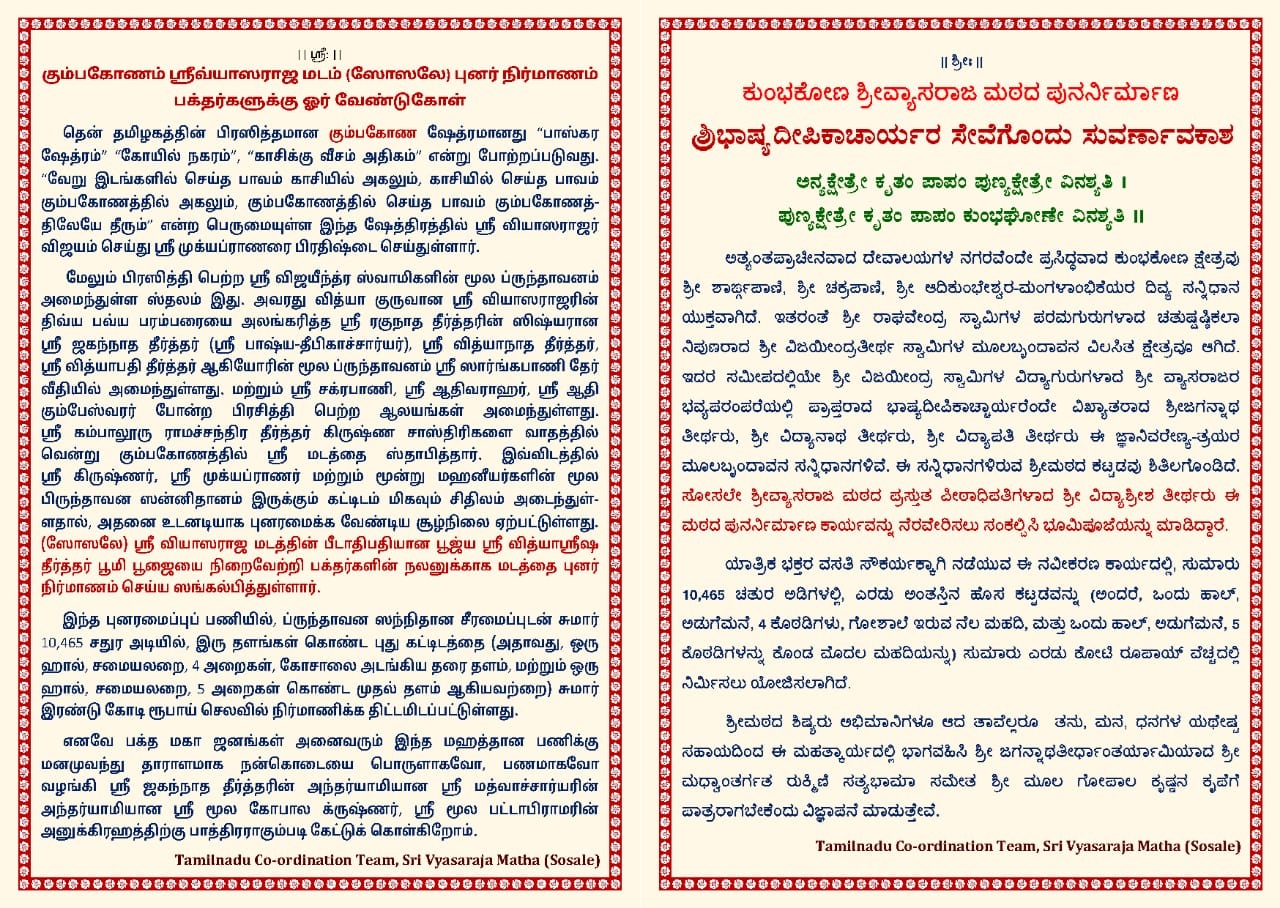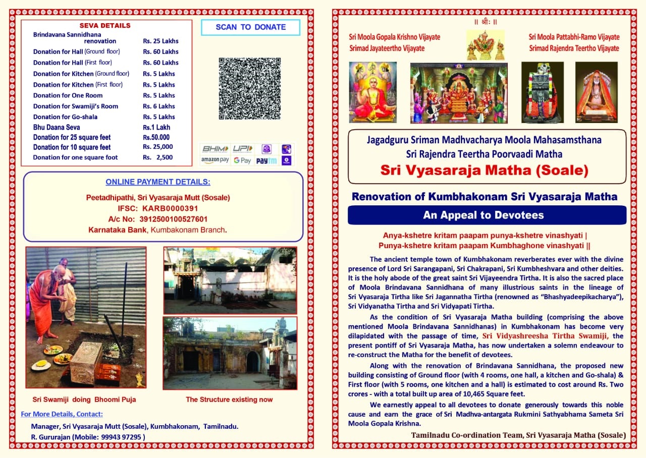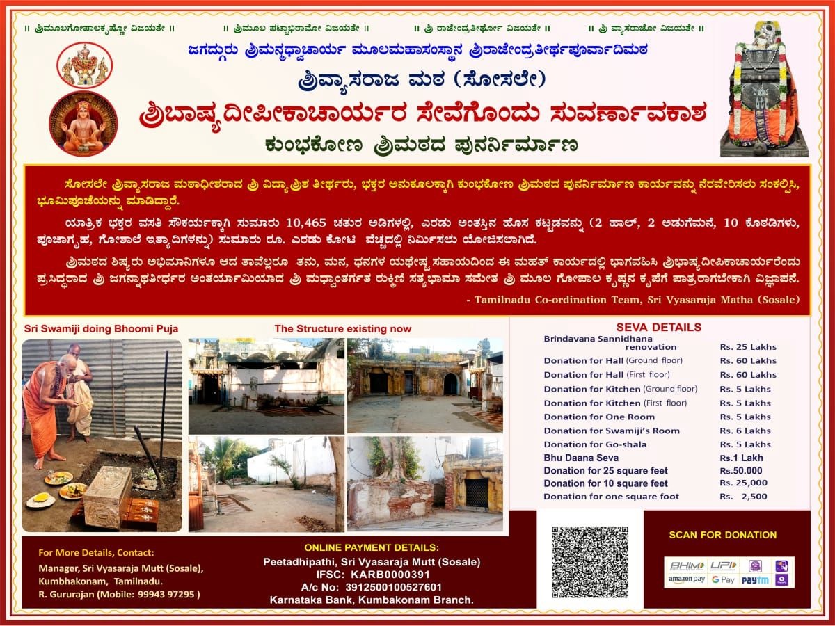 After Sri Sri Vidyashreesha Teerta Swamiji ascended the Sri Vyasarajara Peetah , there has been lot of activities initiated to renovate the depleted structure of the Matha branches across . After successful completion of Chennai & Srimushnam in Tamilnadu, which were inevitable a similar structure, Kumbakonam project is being undertaken . Three Mahayathigalu such as Sri Jagannatha Yathigalu , Sri Vidyanatha Teertaru & Sri Vidyapathi Teertaru moola Vrindavana are present in the Big street , Kumbakonam.