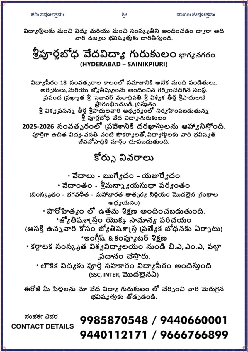 Sri Poornabodha Vidyapeetha is a traditional Vedic institution located in Sainikpuri, Secunderabad, Telangana. Operating under the Sri Vedavyasa Vishwa Kalyana Trust, it is affiliated with the Sri Pejavara Matha, one of the Ashta Mathas established by Jagadguru Sri Madhvacharya in Udupi. YouTube+5madhwasakha.com+5madhwasakha.com+5madhwasakha.com+2shivallibrahmins.com+2Pejawar Avishwa+2