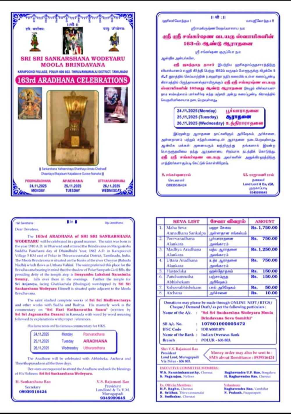163rd Aradhana Celebrations, Sri Sri Sankarshana Wodeyaru Moola Brindavana From Nov 24 to Nov 26, 2025